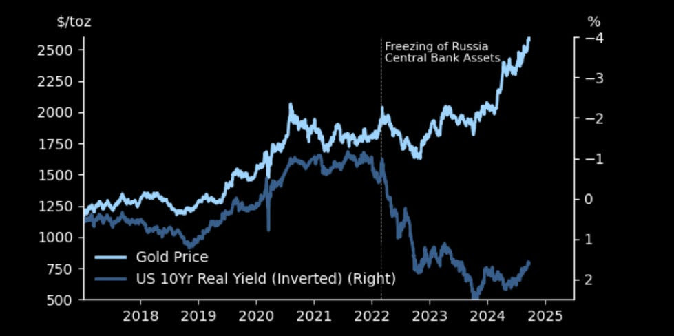 Yes. Many central banks have been increasing their gold holdings — the obvious ones are China and Saudi Arabia. Switzerland is another, and some of the buying may involve private citizens in some cases. There’s been a broader trend among countries that don’t want to hold U.S. assets, particularly adversaries, turning to alternatives like gold. But this flow is unpredictable. Prices slow it down; people don’t buy gold at any price. It’s fairly inelastic — they’ll buy at most prices but not at every price.