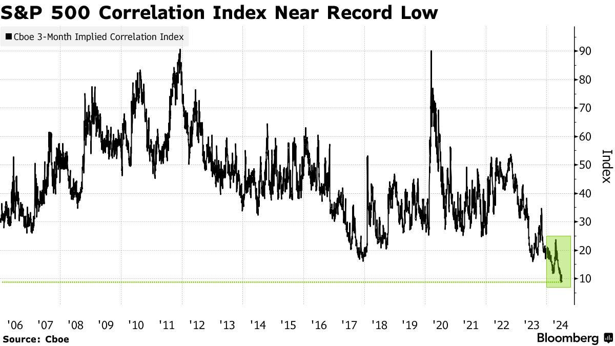 “The market has been broken up into two groups: 1. Nvidia and Magnificent 7; and 2. The other 493. The correlation between those two groups has been low, which has pressured S&P 500 correlation,” explained Chris Murphy, a derivatives strategy co-head at Susquehanna. “When looking at S&P stocks on an equal-weighted basis, the outsized impact of the MAG7 as a group and NVDA specifically is neutralized.”